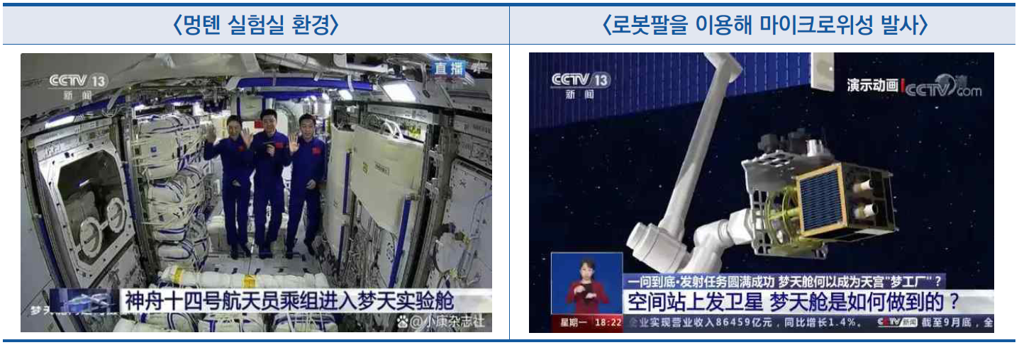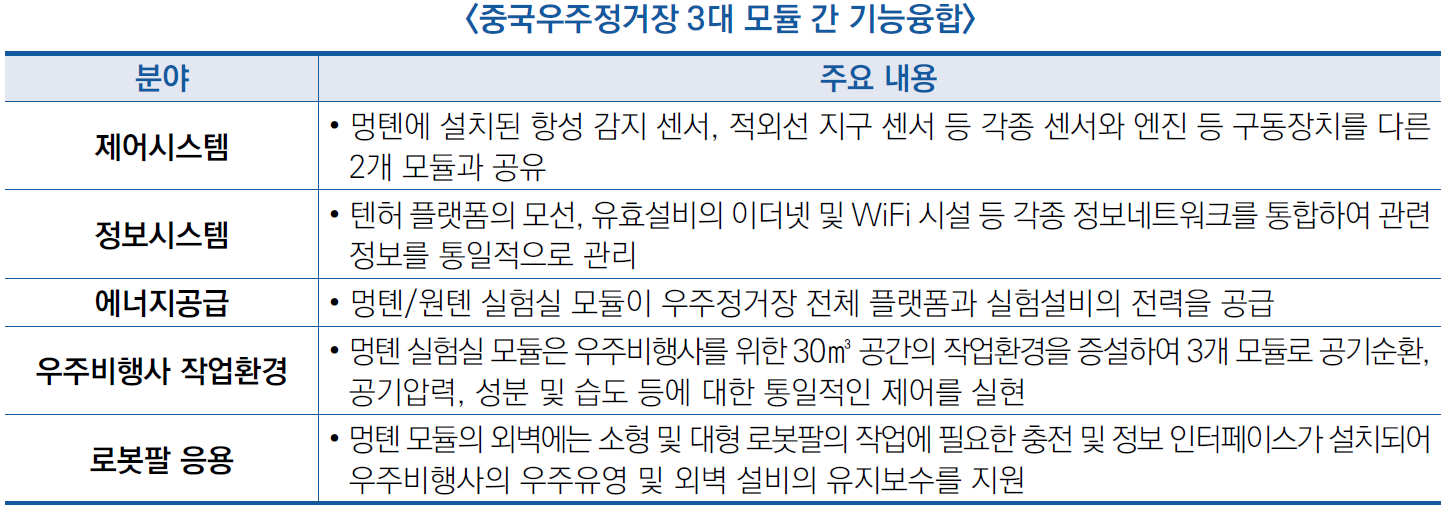 ![]() ○ 중국우주정거장 3대 모듈 융합을 통해 제어・ 정보시스템, 에너지공급, 우주비행사 근무환경, 로봇응용 등 방면에서 기술 개발