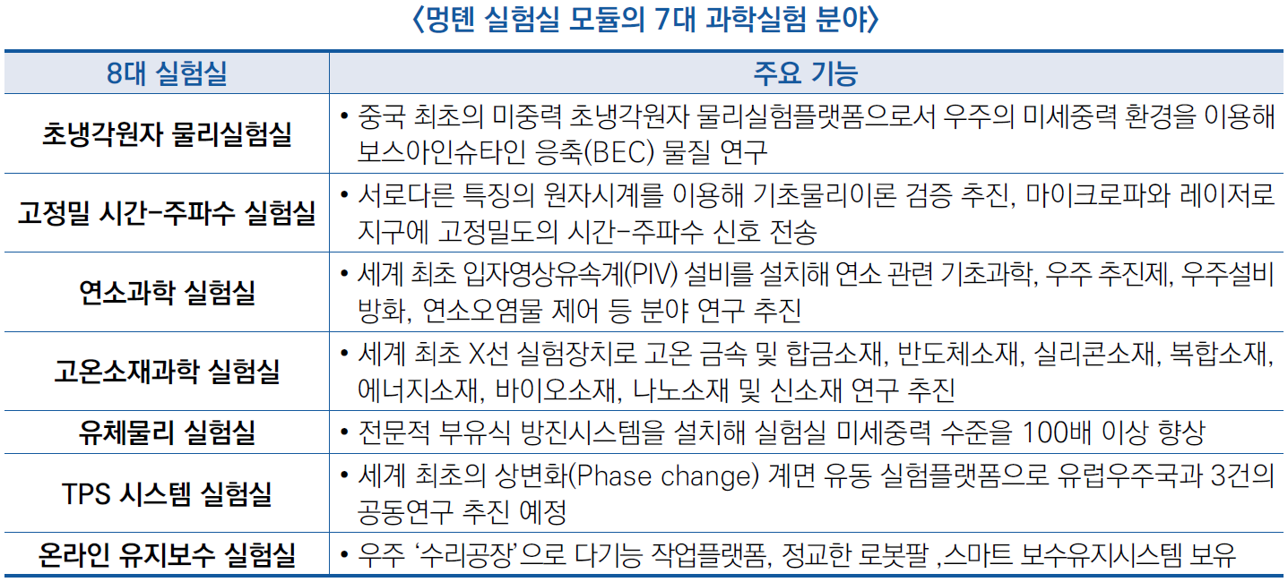 ○ 이번에 발사된 멍텐 실험실 모듈은 원심분리기, 고온용광로, 원자시계 등 연구설비를 갖추고 있어 우주소재과학, 미중력 유체물리 및 연소과학 등 7대 분야의 실험 환경을 구비