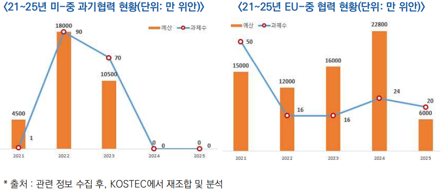 - EU의 예산 규모는 24년 22,800만 위안(438억 원)으로 정점에 도달한 후, 25년에는 6,000만 위안(115억 원)으로 73.7%를 급감했으나 과제 수는 23~25년 동안 16건 → 24건 → 20건 수준으로 유지