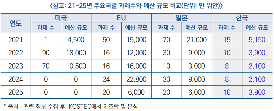 * 예산·과제 수는 비교적 소규모이나, 과제당 예산 단가 수준은 일본·EU 등 주요국과 유사한 수준 유지
