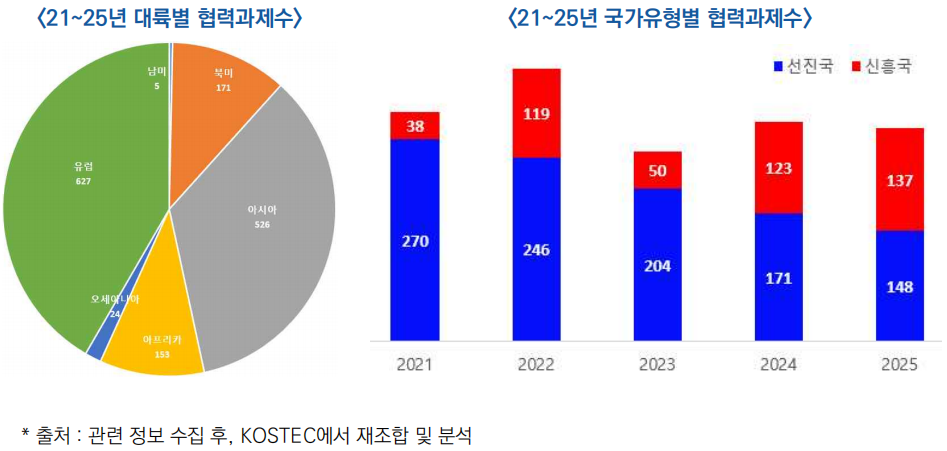 - 신흥국과의 협력과제 수는 38건에서 137건으로 3.6배 이상 증가하면서, 24~25년에는 선진국을 앞지르는 전환점을 맞이하였음