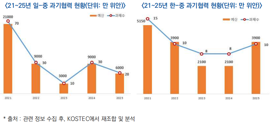 - 일본의 예산 규모는 21년 21,000만 위안(403억 원) → 22년 9,000만 위안(173억 원) → 23년 3,000만 위안(57억 원)으로 빠르게 하락한 뒤, 24년 9,000만 위안(173억 원), 25년 6,000만 위안(114억 원)으로 등락 반복하고 있음