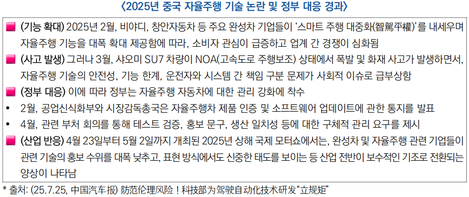 ○ (배경) 중국은 자율주행 기술의 급속한 발전에 대응하여 윤리적 리스크를 보완 필요