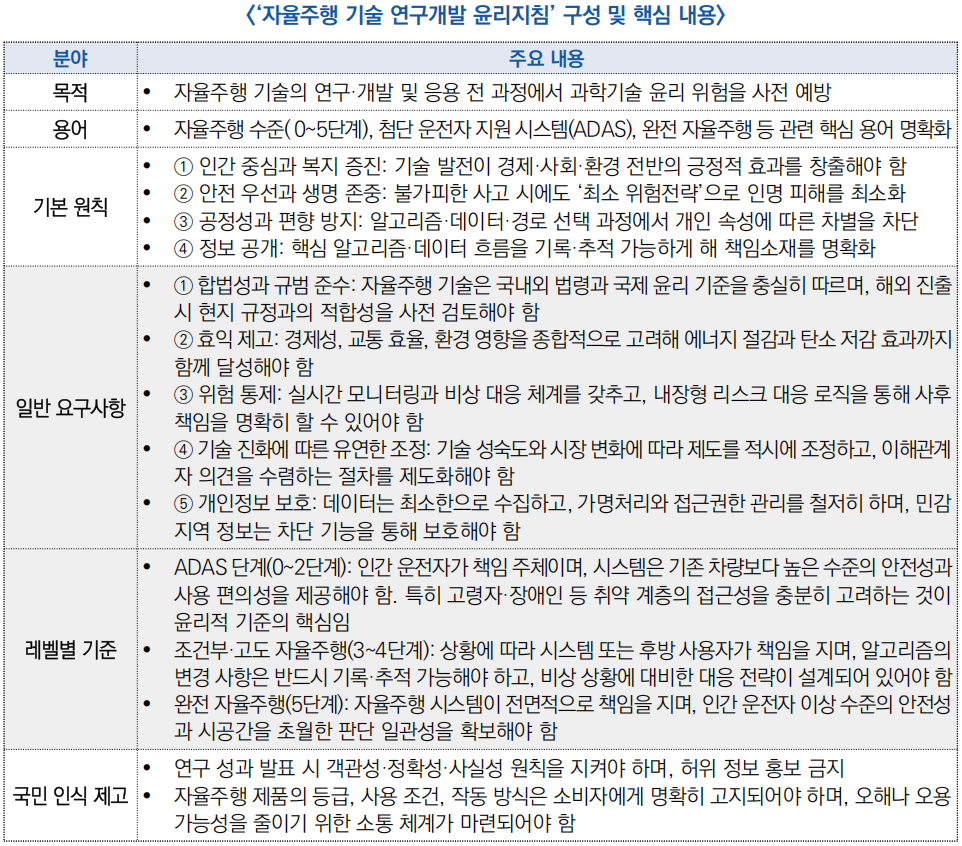 ![]() ○ (내용) ‘자율주행 기술 연구개발 윤리지침’은 총 6개 항목으로 구성되어 있으며, 4대 기본 원칙과 5가지 일반 요구사항을 중심으로 윤리 기준을 구체화함