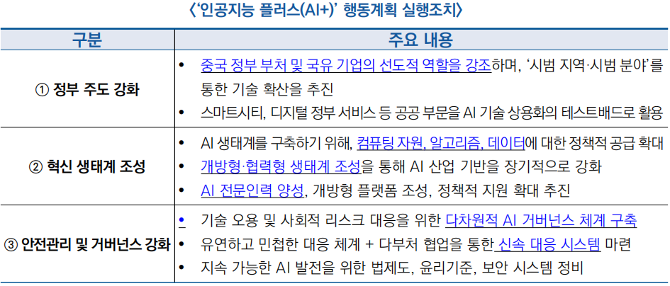 - ①‘누가 AI를 활용할 것인가 (정부 및 국유기업 주도)’, ②‘무엇으로 이를 뒷받침할 것인가( 컴퓨팅 자원, 데이터, 알고리즘 등 핵심 인프라)’, ③‘어떻게 안전하게 운영할 것인가(다부처 협업 거버넌스)’라는 세 가지 핵심축을 정립함으로써, ‘AI+’ 정책의 구조적 실행 기반을 마련