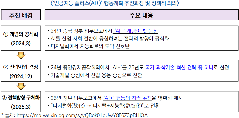 ○ 이번 의견은 2024년 정부 업무보고에서 ‘AI+’가 처음 명시된 이후, 국가 차원의 정책 방향성을 본격적인 실행 단계로 전환한 두 번째 이정표로 평가됨