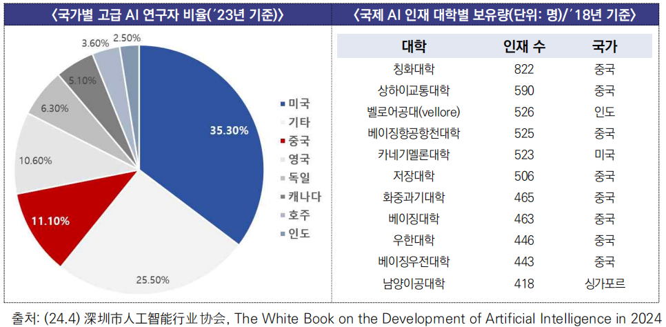 ○ 기관차원에서 2023년 기준, 중국 내 500개 이상 고등교육기관에서 AI 관련 학과·학원이 개설되어 있으며, 칭화대·북경대 등 상위 대학 주도로 기초연구와 인재 양성을 병행