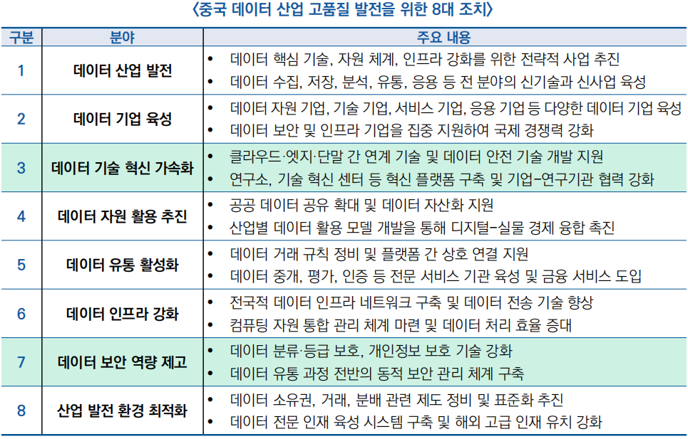 ○ 24년 12월 국가데이터국 등 6개 부처는 ‘데이터 산업 고품질 발전에 관한 지도 의견’을 발표하고, 데이터 기술 혁신 및 인프라 지원 강화 등 8대 조치를 제시한 바가 있음