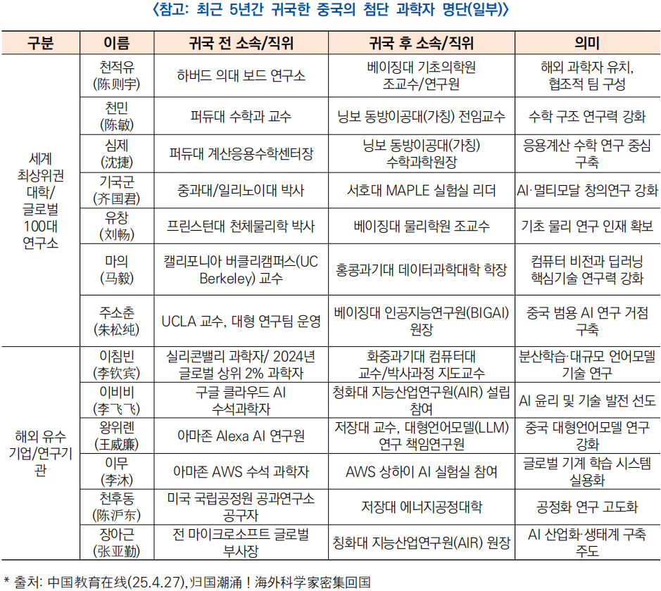 - 미국 국가과학원 회보(PNAS) 자료에 따르면 2010~2021년 사이 약 1만 2,500명의 화교(華裔) 과학자가 미국에서 중국으로 이동