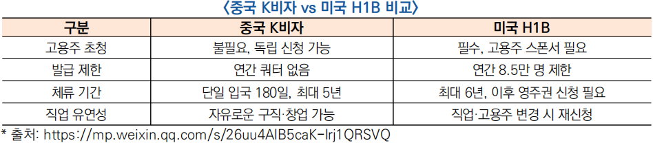 ![]() - (미·중 비교) H-1B 비자가 미국의 글로벌 기술인재 수급의 ‘대표 경로’인데, 신청자 대비 낮은 선정율, 고용주 종속성, 직장 이동 제한 등 구조적 한계가 있는 반면, 중국 K 비자는 고용계약 조건이 없고, 자유로운 구직 및 창업 활동이 가능