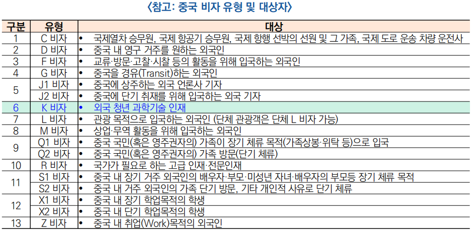 ![]() ○ (K비자 추가) 최근 중국 국무원은 ‘중화인민공화국 외국인 출입국 관리 조례’ 개정안을 승인하고 기존 12가지 비자 유형에 더해 외국의 청년 과학기술 인재에게 발급하는 ‘K비자’관련 항목 추가