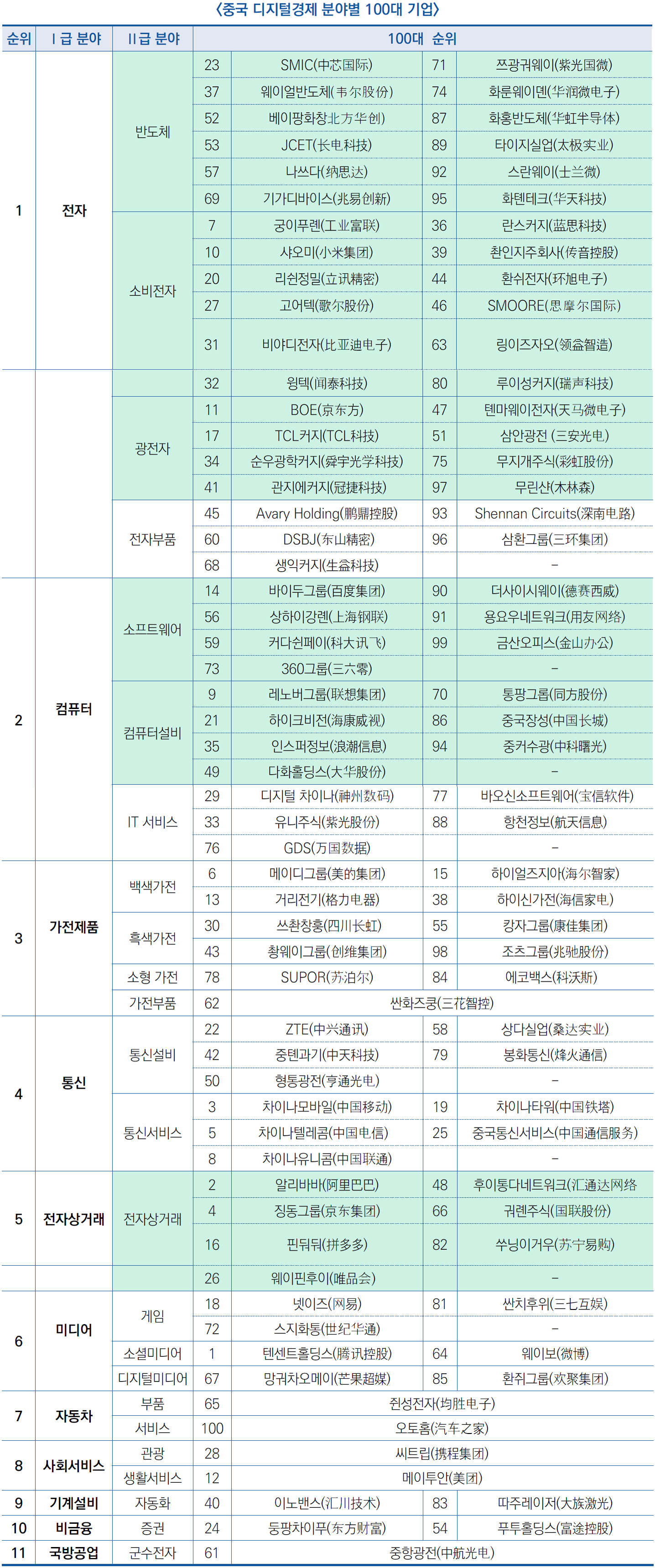 ○ 중국 디지털경제 100대 기업 중 1위는 텐센트그룹이 2조 9163억 위안(567조 9,785억원) 차지했으며, 평균 100대 기업 시가 총액은 1645억 위안에 해당