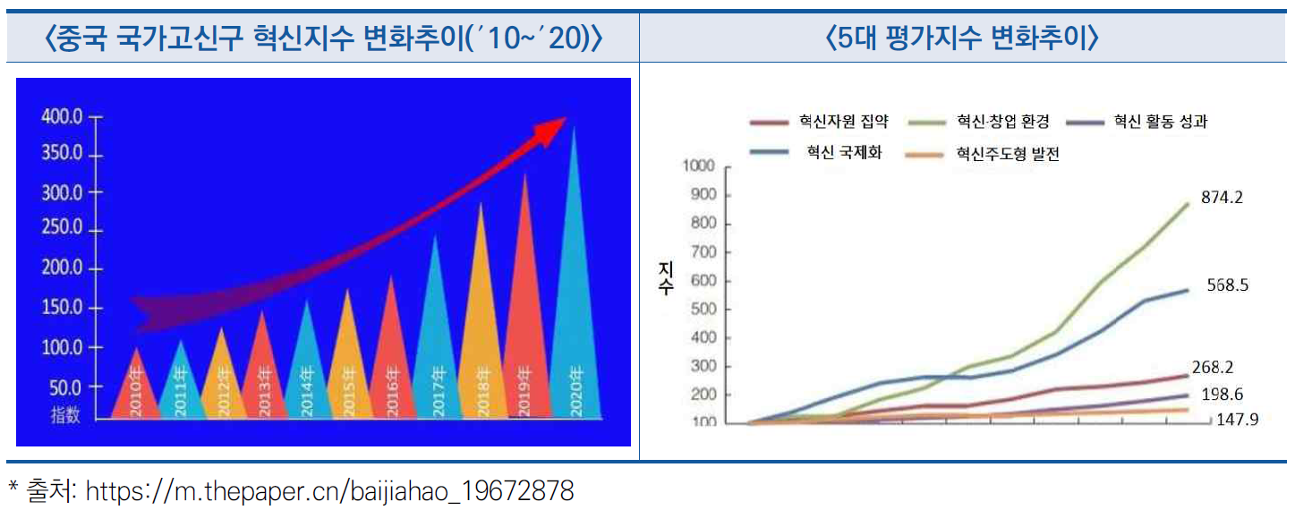 - ′13년부터 과기부 화거첨단기술산업개발센터와 중국고신구연구센터는 국가고신구 혁신역량 평가지표 시스템을 공동으로 연구・제정하여 연간 평가보고서를 발표