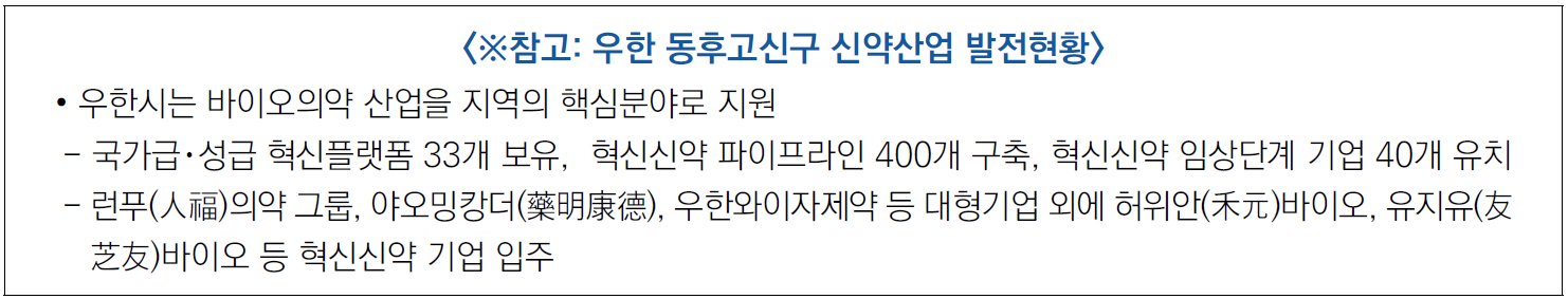 ○ 이번에 우한동후고신구는 혁신신약 산업기지 구축을 위한 「혁신신약 산업발전 추진정책」을 발표