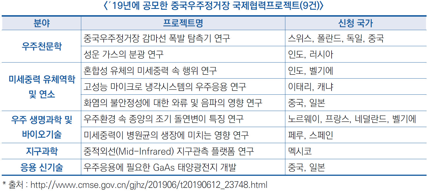 - 향후 2~3년마다 중국우주정거장 국제협력과제를 공모할 예정