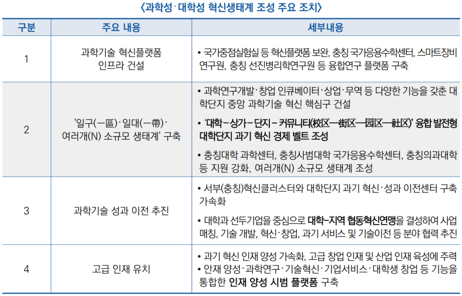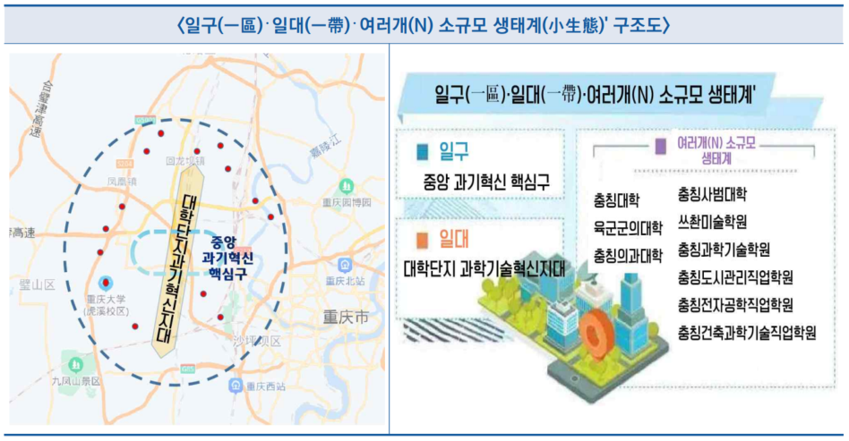 ○ (주요 목적) 충칭 혁신클러스터의 종합자원과 대학단지의 과학기술 혁신자원 융합을 통하여 과학기술성과 이전 가속화, 혁신클러스터 내 대학단지 혁신생태계 조성