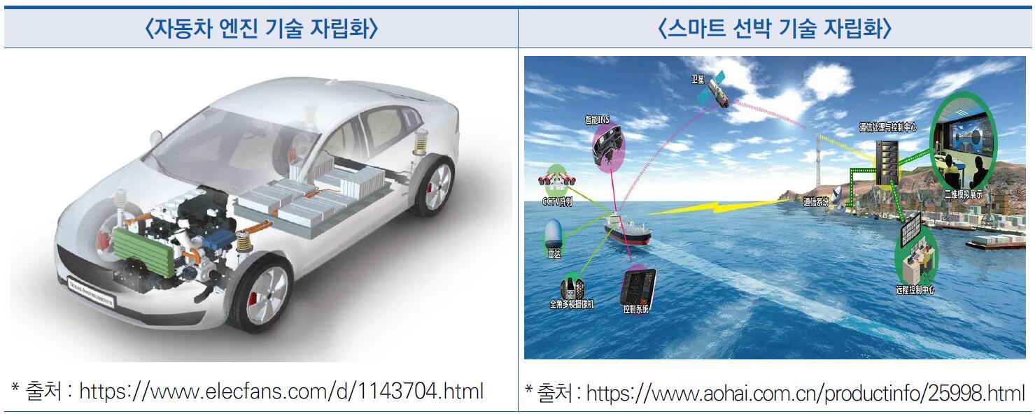 - 자동차・민영 비행기・선박 등 장비 엔진 시스템 개발 강화, 청정에너지 선박, 스마트 선박, 중대형 크루즈, 극지 운항 선박 등 자립화 제조 추진