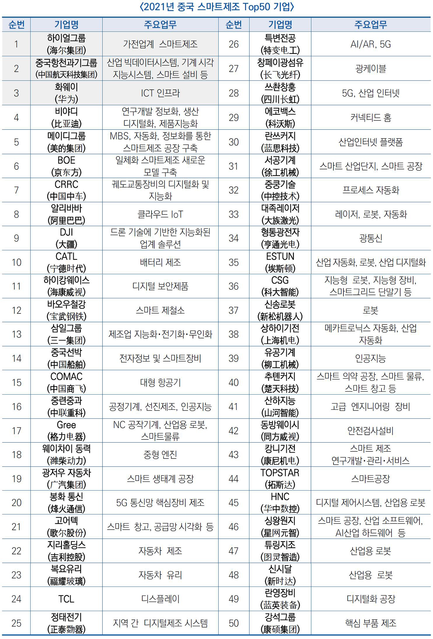 | 2021년 ‘중국 스마트제조 50대 기업 명단’ 공개 | ||