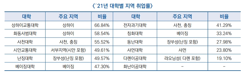 ● 기존 졸업생들이 베이징・상하이・광동 등 대도시로 취업을 선호했던 것과 달리 코로나 장기화로 인해 대학 소재지 및 주변 지역 취업을 선택