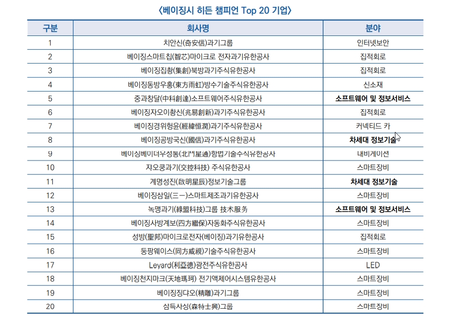 ▣ 최근 베이징시 경제・정보화국(北京市經濟和信息化局)과 공상업연합회(工商業聯合會)은 공동으로 베이징시 히든 챔피언 기업 상위 20개 사를 선정(1.25)