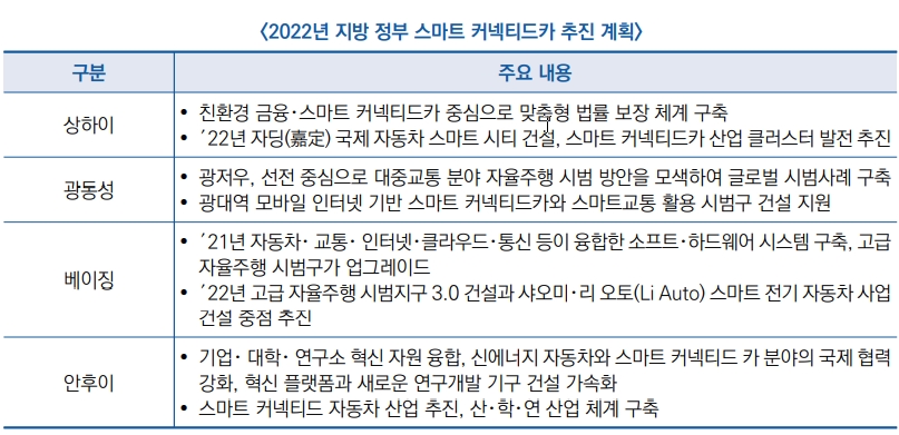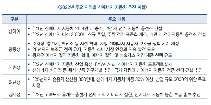 ▣ ′22년 지방 양회에서 신에너지 자동차 소비, 스마트 커넥티드카 혁신발전, 전기 자동차 충전소 인프라 확대 등을 발표 (2.11)