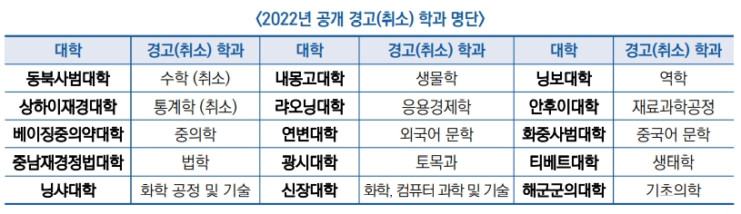 ● 평가결과, 이 중 취소된 학과가 2개, 경고 조치는 13개 학과에 해당