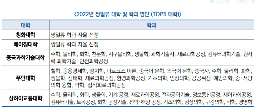 ● 제1차 쌍일류 대학 평가에서 최고 성과를 거둔 베이징대학, 칭화대학은 자율적 쌍일류 학과 선정이 가능해짐
