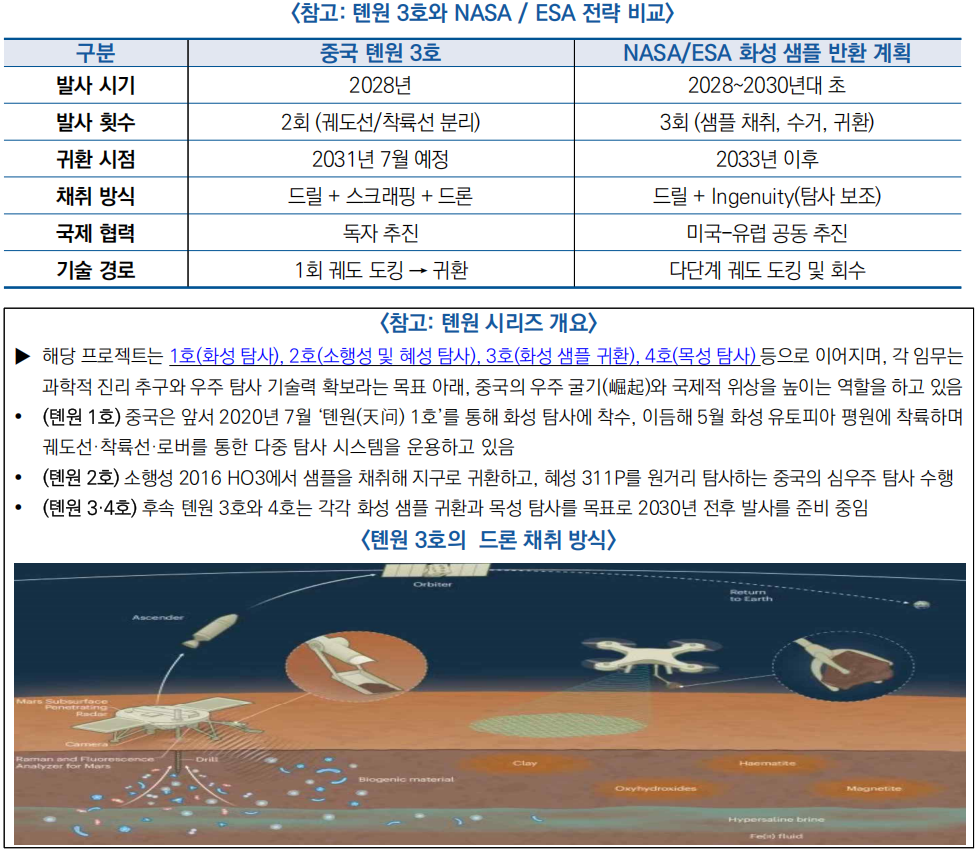 □ (국제 비교) 톈원 3호 임무는 단순한 기술 경쟁을 넘어, 화성 샘플 반환이라는 인류 우주탐사의 중요한 이정표로서 미·중 간의 전략적 우주 주도권 경쟁이 본격화되었음을 상징