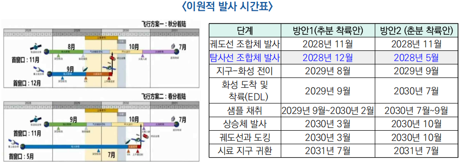 ▶ 1차 발사 (2028년 11월 예정): 샘플 귀환을 담당할 궤도선(orbiter)을 화성 궤도에 투입, 채취된 샘플과의 랑데부 및 귀환 준비 수행