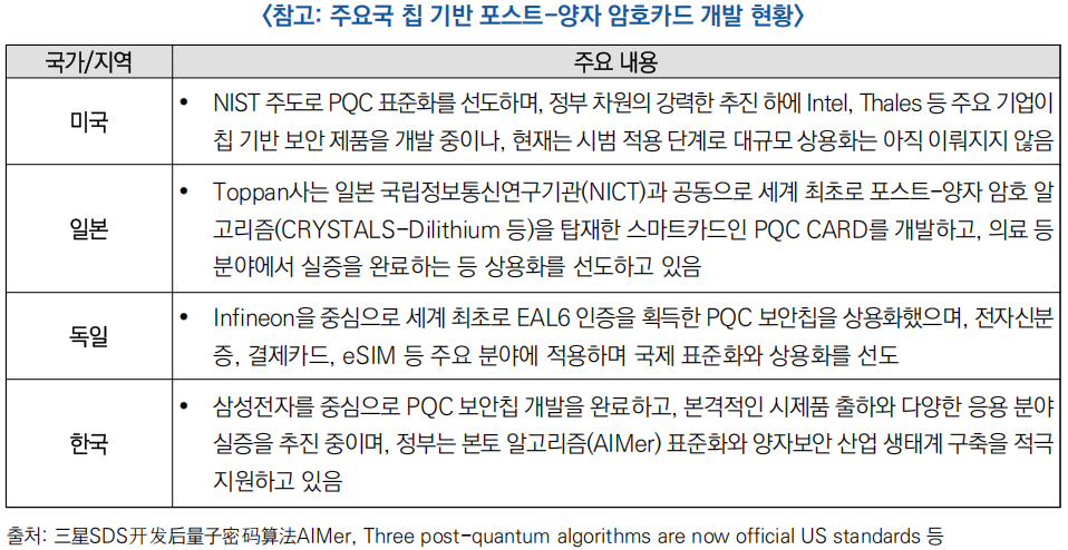○ (글로벌 현황) 현재 포스트-양자 암호(PQC) 국제 표준화는 미국 NIST 주도로 진행 중이며, 일본·독일·한국 등 주요국도 칩 기반 PQC 보안 제품 개발에 속도를 내고 있음