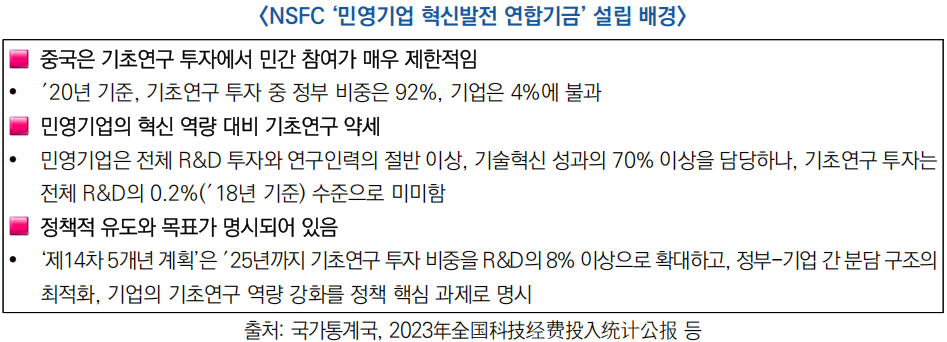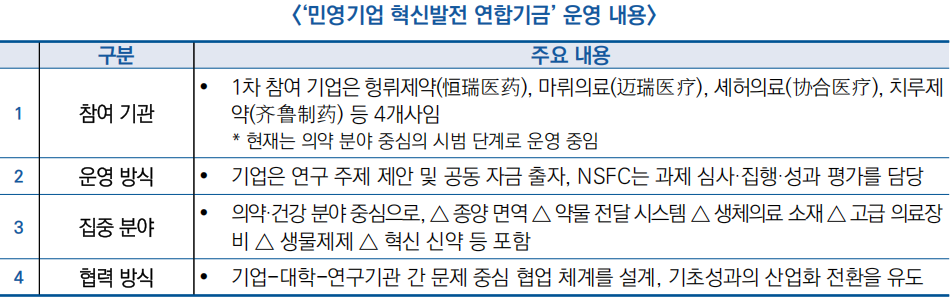 * NSFC는 기존에도 ‘연합기금’ 제도를 운영해 왔으나, 주로 지방정부나 국유기업, 중앙기업과의 협력이 중심이었으며, 민영기업 참여는 극히 제한적이었음
