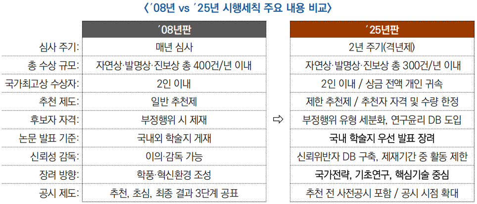 ![]() ○ (변화) 이번 개정은 심사주기 조정, 수상 규모 통제, 추천 및 심사 절차의 구체화, 연구윤리 강화, 국가전략 중심의 장려방향 명확화 등에 초점이 있음
