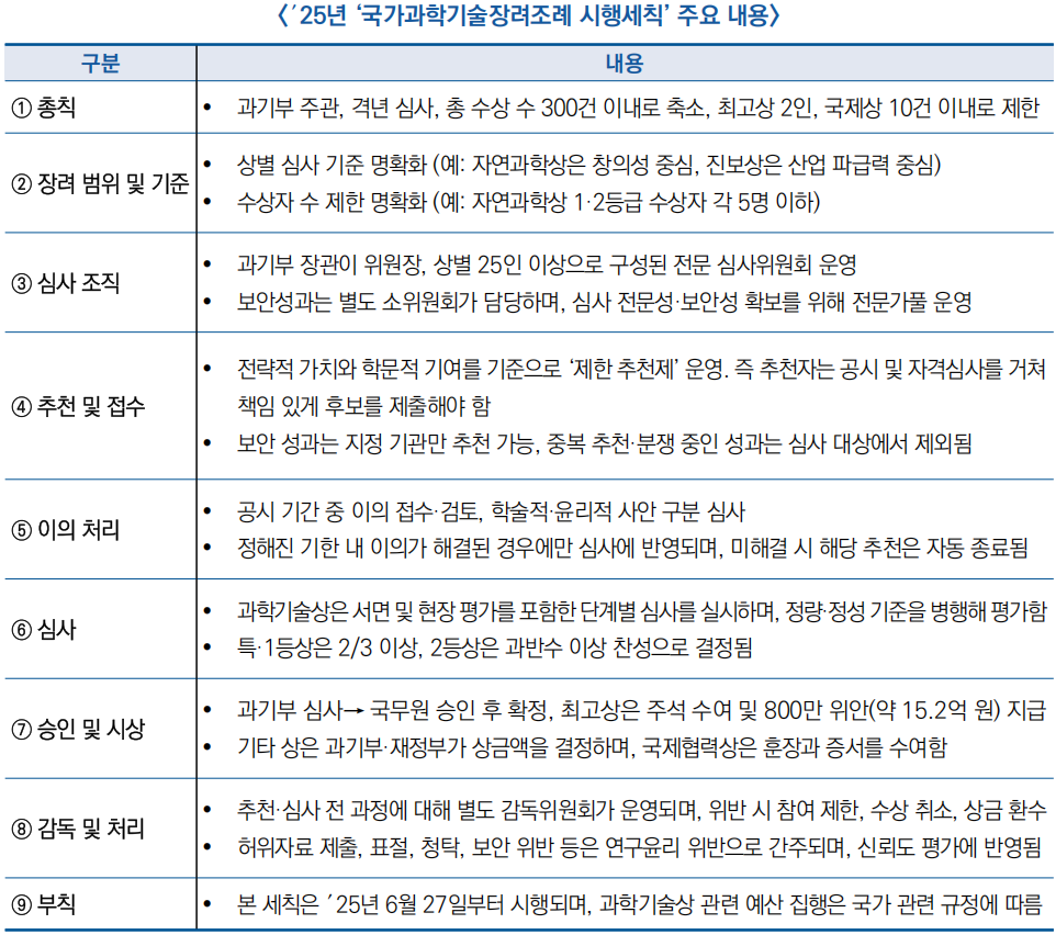 □ 과기부는 ‘국가과학기술장려조례 시행세칙’을 개정하여 공정성·전문성·전략성을 강화(25.6.30)