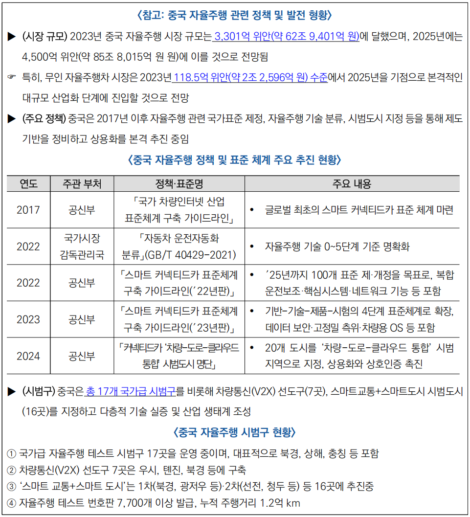 □ 중국 신문망에 따르면 북경 첨단 자율주행 시범구의 규모는 600㎢에 달했으며 클라우드 기반 통합 플랫폼을 통해 800대 이상의 자율주행 차량 운행을 지원하고 있다고 밝혔음(25.6.16)