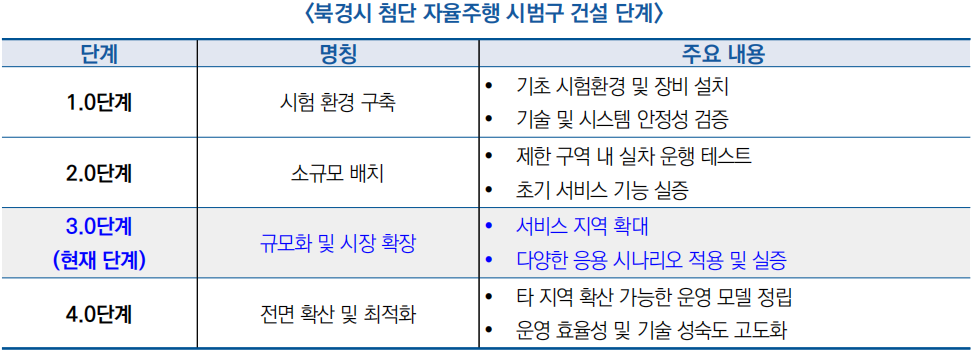 ![]() ○ 해당 시범구는 “소규모 실증→단계적 확대”방식을 채택하여 3~6개월을 1개 사이클로 하는 4단계 건설 로드맵을 적용