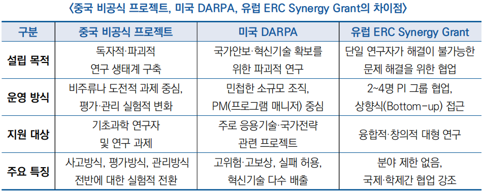 ○ (국제비교) 미국, 유럽 등 주요 과학기술 선도국들은 이미 파괴적·전위적 연구를 위한 제도(예: DARPA, ERC Synergy Grant 등)를 운영 중이며 운영 방식, 지원 대상, 제도적 목적에서 다양한 전략을 취하고 있음
