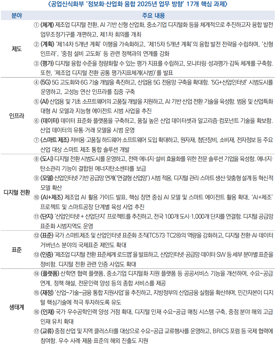 □ 공업신식화부는 ‘정보화·산업화 융합 2025년 업무 방향’을 발표하고, 제도, 인프라, 디지털 전환, 표준, 생태계 등 5대 분야 17개 핵심 과제를 제시(25.7.12)