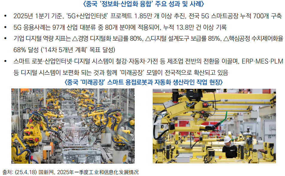 ○ (정책 배경) 중국 산업은 ‘규모는 크지만 혁신은 약하고, 구조는 비효율적이며, 생산성은 낮다’는 구조적 한계를 안고 있었음. 이에 따라 2002년 ‘정보화·산업화 융합’ 개념이 도입되고, 2007년에는 국가 전략으로 격상되어 산업 고도화와 구조 개편의 핵심 경로로 정착함