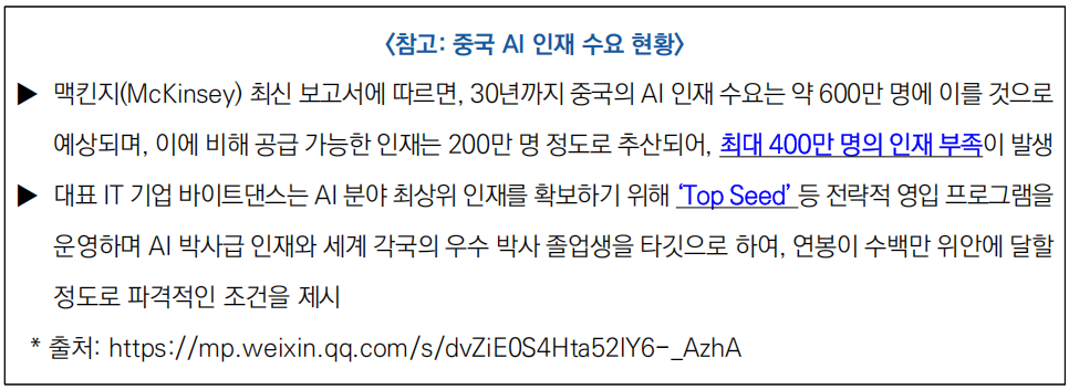 - 반면 미국 학부 출신은 18%에 불과해, AI 기초 교육 부문에서 중국이 글로벌 리더로 부상한 실상을 반영함