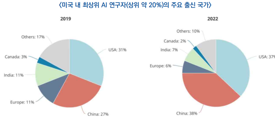 ○ 최신 보고서에 따르면, 미국 내 최상위 20%에 해당하는 AI 연구기관들에서 중국계 연구자의 비중이 38%로, 미국 출신(37%)을 앞질러 최대 비중을 기록