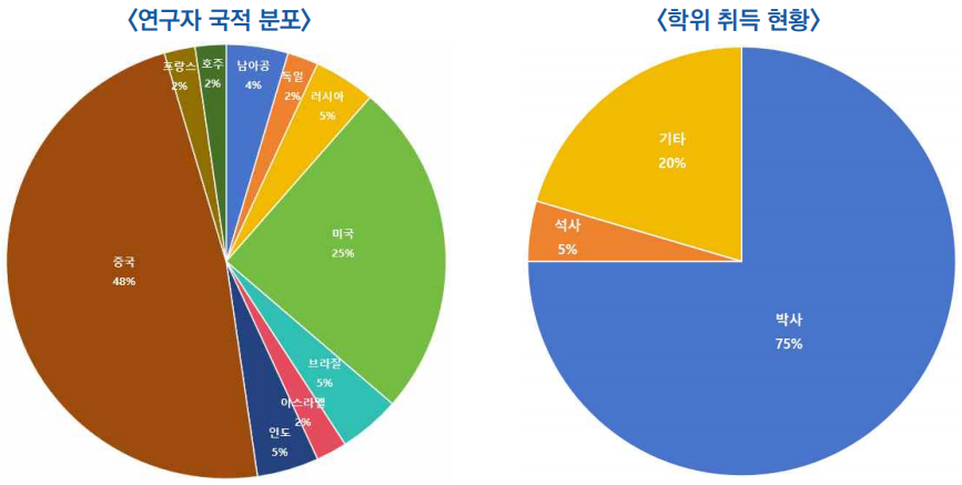 ○ (고학력 중심) 전체 인력의 75%가 박사 학위 보유자이며, 연구직 비중도 70%에 달함