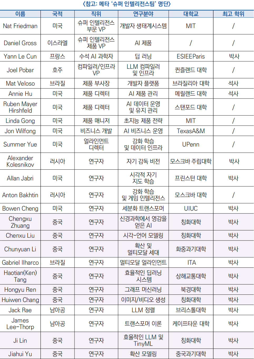 □ 7월 20일 벤처투자자 디디(Deedy)가 공개한 메타 ‘슈퍼 인텔리전스 팀’ 44인의 명단에서 절반이 중국 출신으로 확인되었으며 이는 AI 최전선에서 중국계 인재가 핵심 기술 인력으로 자리 잡고 있음