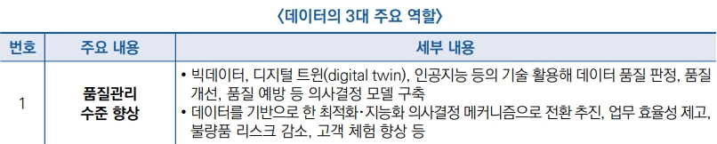 – 4대 원칙 중 특히 데이터는 토지, 노동력, 자본과 기술에 이어 제5대 생산요소로서 무한 복제・공유가 가능하여 품질관리 수준 향상 등에 있어 미치는 영향력이 매우 큼