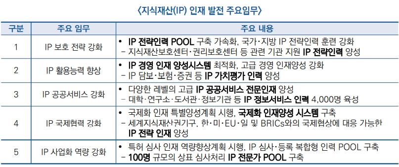 ● IP 인재양성을 위해 △IP 인재양성훈련기지 조성 △IP 온라인 교육과정 개설 △IP 인재거점 구축 △IP 싱크탱크 전문가 인재뱅크 구축 △IP 직무평가 △IP 전문학위 개설지원 등 6가지 프로젝트 추진 |