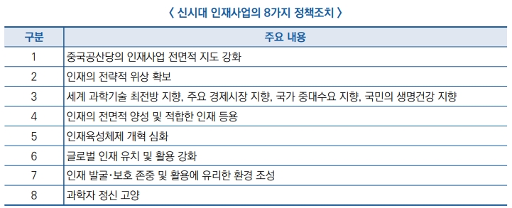 – 지역적으로 북경, 상하이, 웨강아오대만구(粤港澳大湾区, 광동-홍콩-마카오)에 고급인재고지를 구축하며 고급인재가 집중된 일부 중심도시로의 인재 유치 강화 플랫폼 구축 주력 |