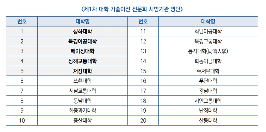 ▣ 최근 중국 과기부 성과이전지역혁신국과 교육부 과학기술정보화국은 공동으로 제1차 대학 기술이전 전문화 시범기관 명단을 발표(10.9)