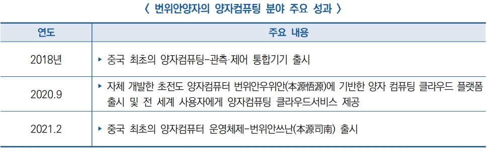 – 번위안양자는 중국과학원 양자정보중점실험실로부터 양자컴퓨팅 분야의 기술지원을 받아 양자컴퓨팅 상용화 진출에 성공한 기업으로 현재 약 500건의 특허를 보유하고 있으며 국내 1위, 세계 7위를 차지
