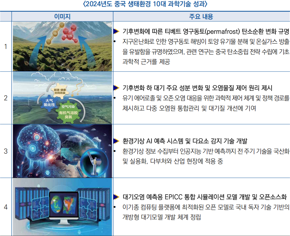 □ 중국과학기술협회 생태환경산학연합체*는 베이징에서 ‘2024년도 중국 생태환경 10대 과학기술 성과’를 공식 발표(25.6.5)