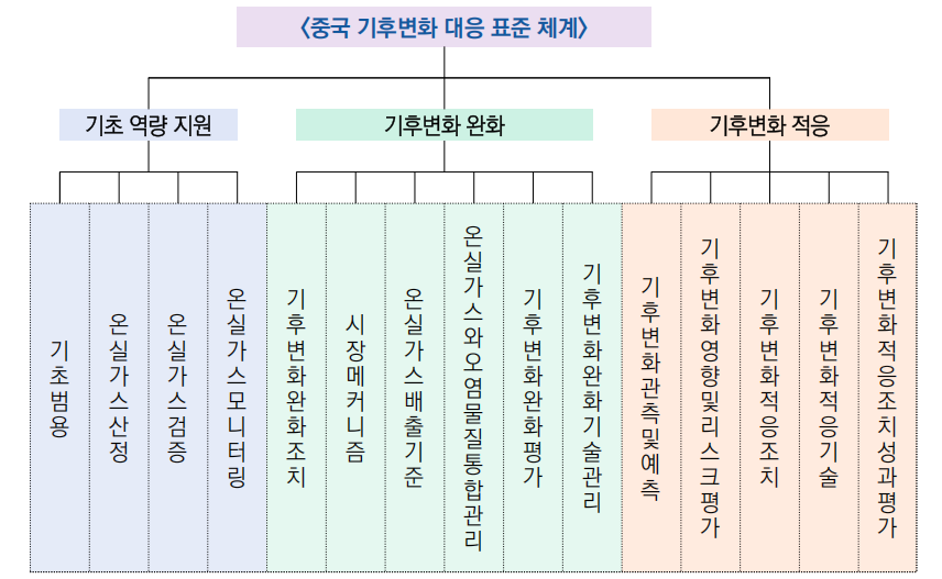 - ‘국가 표준화 발전 강요(′21.10.10/국무원)’에서는 ‘기후변화 대응 표준을 총괄적으로 정비하고, 기후변화 완화·적응·모니터링 및 평가 등 분야의 표준을 제정 및 개정한다’고 명시