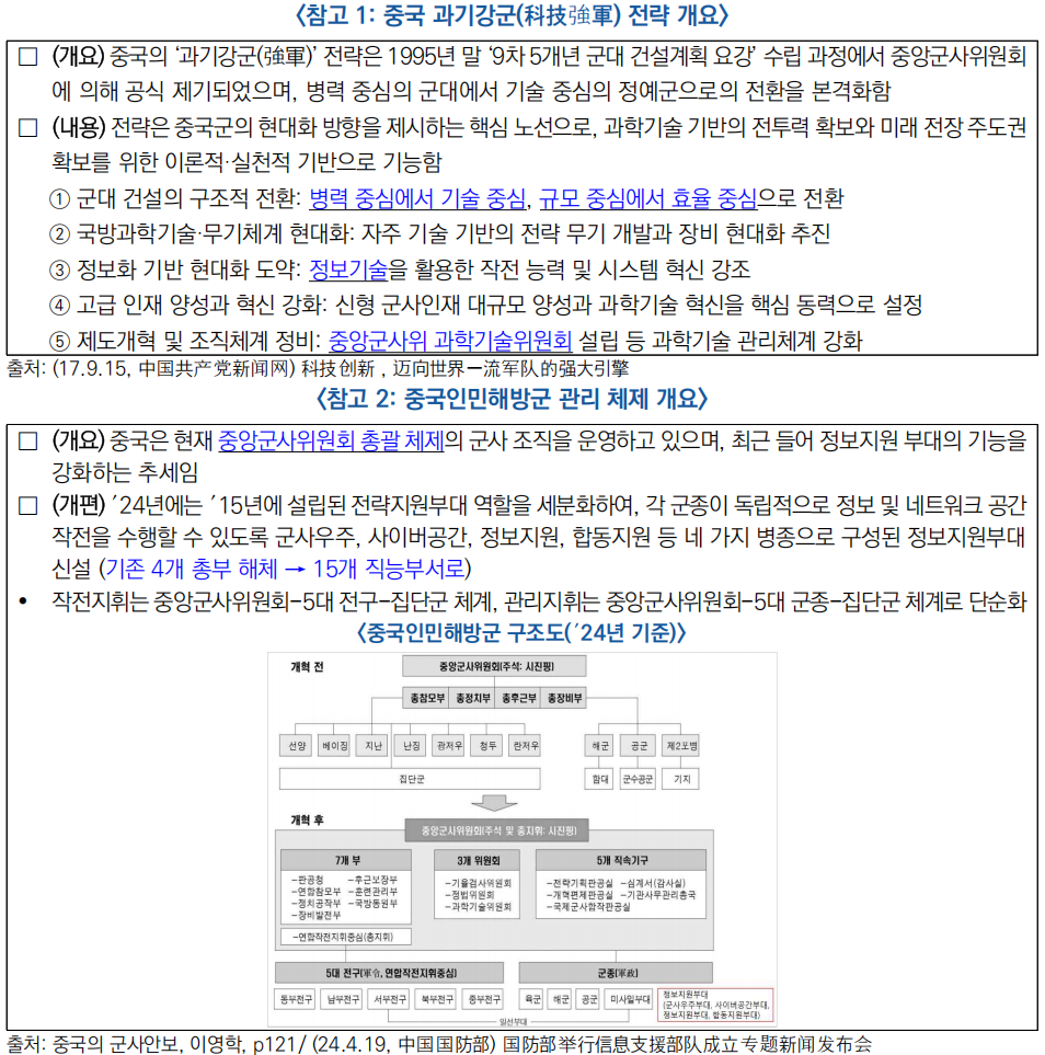 ○ 중국 정부의 예산 편성*과 ‘군사과학연구 포상조례’ 제정 등 제도 기반 마련 사례를 보면, 국방 및 과학기술 분야에 대한 재정적 투자와 제도적 지원을 지속적으로 강화하고 있는 것으로 시사함